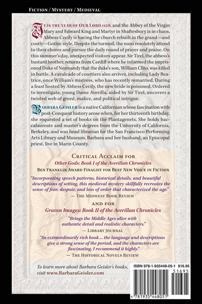 OVERVIEW In 11th-century England, Abbess Cecily hosts a dinner at Shaftesbury Abbey. Among the guests are Cecily’s half brother, Tirel, a knight and world-weary veteran of the Crusades, Sir Baudri de Beaumont and his lovely wife, Beatrice, and Beatrice’s look-alike sister Sophina. As minstrels, jugglers, and acrobats amuse the diners, Beatrice suddenly collapses in agony and breathes her last. It now falls to Dame Averilla, a headstrong young nun, Sir Tirel, and Bailiff Robert Bradshaw to investigate. The three must determine whether a crime has indeed been committed, or whether the death, which appears to have been caused by poisoned food, was a dreadful accident. In the process, they discover that the woman who actually succumbed to the poison might not have been Beatrice, and that the murder may have arisen either from jealousy and avarice among the nobility, or was a politically driven outrage ordered by King Henry himself.